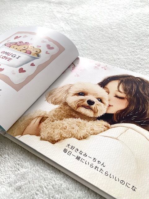 実際の制作では、ワンちゃんの個性やご家族の想いを丁寧にヒアリングし、1冊ずつ心を込めてお作りします。